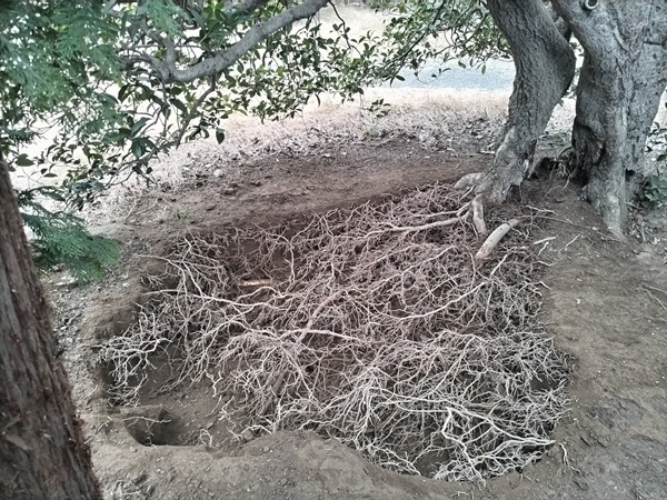 わかりにくいですが、土が硬く地表付近にしか根がありません。地表から30㎝ぐらいのとこらから下は根があまり見当たりません。このキンモクセイは何とか面的に根を張りますが、深さに対して根を張れません。浅いところは、乾燥や温度差の影響も受けやすいです。